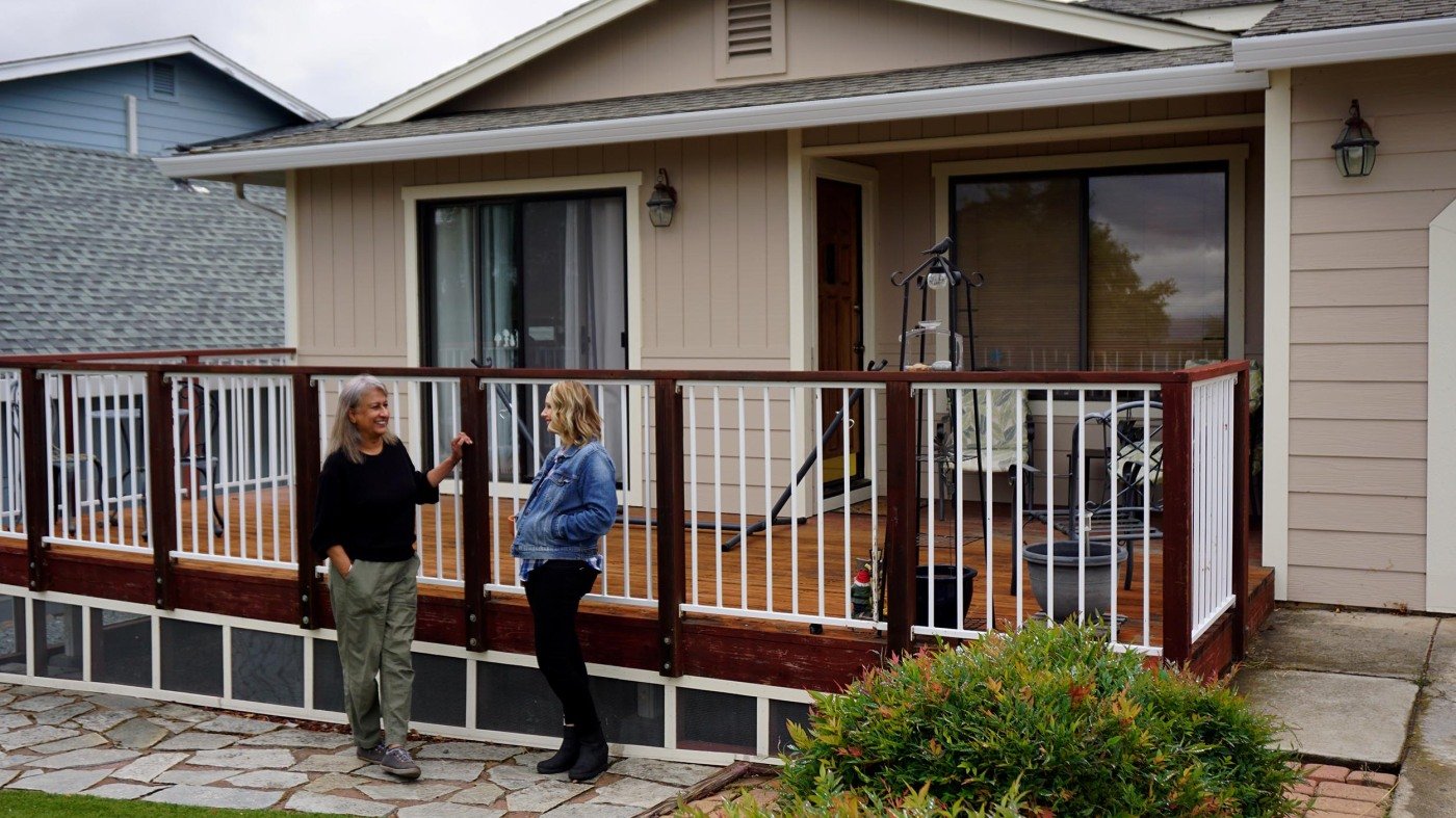 Homeowner Penny Sidhu (left) has evacuated from wildfires three times. Her home is now being retrofitted to make it less likely to ignite, including installing screens under her deck to prevent embers from collecting. It’s part of the Lake County Home Hardening Program, which Deanna Fernweh (right) helps manage.